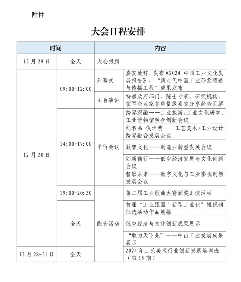 为深入学习贯彻习近平文化思想,赋能新型工业化建设,落实工业和信息化部等八部门印发的《推进工业文化发展实施方案(2021-2025年)》,凝聚工业文化赋能强国建设的社会共识,构建工业文化发展新格局,工业和信息化部工业文化发展中心会同中山市人民政府、广东省工业和信息化厅将于12月30日在广东中山共同举办2024工业文化发展大会。