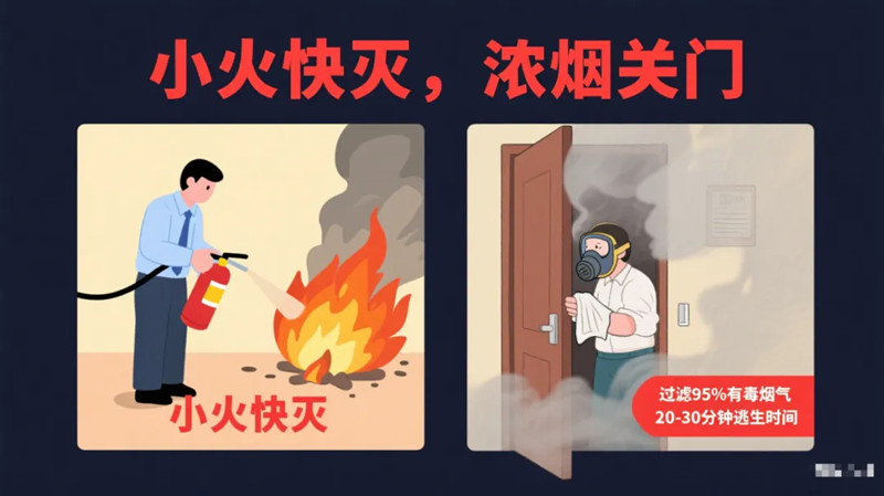 关于逃生自救,消防人员着重强调了 “小火快灭,浓烟关门” 的逃生口诀。当火情处于初期、火势较小时,要及时利用身边的工具进行灭火;一旦火势变大、浓烟密布,就要立即关闭防火门隔绝烟气,耐心等待救援。同时,消防人员特别提醒,湿毛巾过滤有毒烟气的效果欠佳,而防护面罩能过滤 95% 的有毒烟气,使用时需拔掉内外灌塞,正确佩戴,并且要在 20-30 分钟内完成逃生。