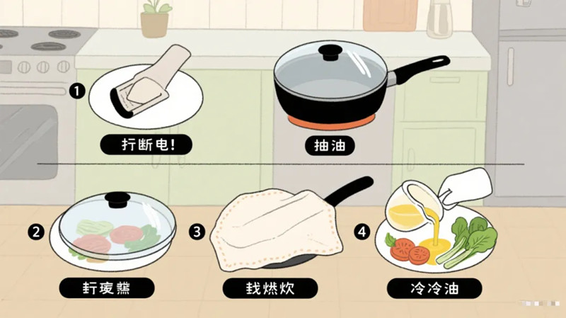 在灭火方法上,消防人员进行了细致指导。当油锅起火时,在断电后可以采用锅盖、湿毛巾覆盖,或者倒入冷油、放入蔬菜等方式灭火。