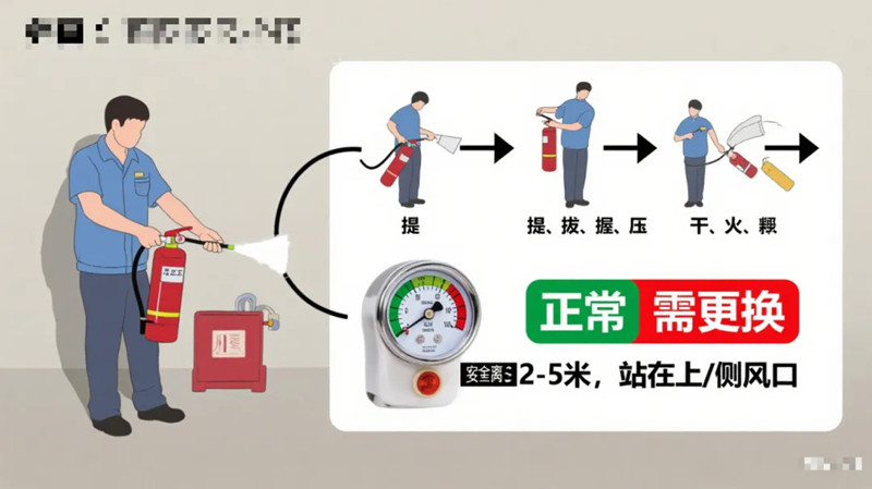 使用干粉灭火器则要牢记 “提、拔、握、压” 四步要领,使用过程中要保持 2-5 米的安全距离,并且站在上风口或侧风口。值得注意的是,干粉灭火器的维护也不容忽视,钢瓶若没有问题可使用 10 年,干粉的有效期为 5 年,使用后或者气压不稳时每两年需要重装,使用前一定要检查压力表,确保指针处于绿色区域。