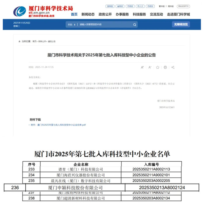近日,厦门市科学技术局发布关于2025年第七批入库科技型中小企业名单的公告。申颖科技经过严格审核与公示程序,凭借在专业商用洗净领域的技术积累与持续创新能力成功入选。